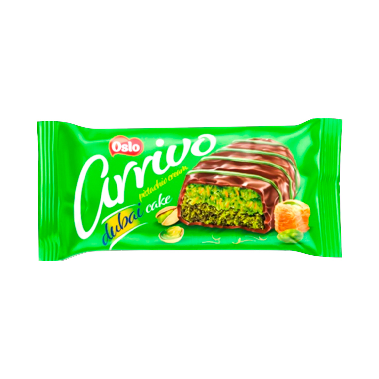 Батончик бисквитный "ARRIVO" с фисташковой начинкой — это бисквитный десерт в какао-глазури с фисташковым кремом, вдохновлённый популярной «дубайской» сладостью. Десерт сочетает в себе мягкий бисквит с насыщенным фисташковым кремом и хрустящими нитями теста кадаиф, покрытые какао-глазурью.