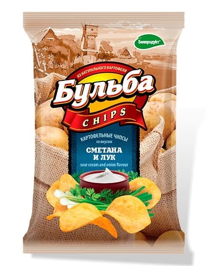 Чипсы картофельные "Бульба" со вкусом сметаны и лука — классические чипсы, приготовленные из свежего картофеля, обжаренные в подсолнечном масле и приправленные ароматной смесью сметаны и лука. Имеют хрустящую текстуру и насыщенный вкус, являются популярным выбором для перекусов и закусок.