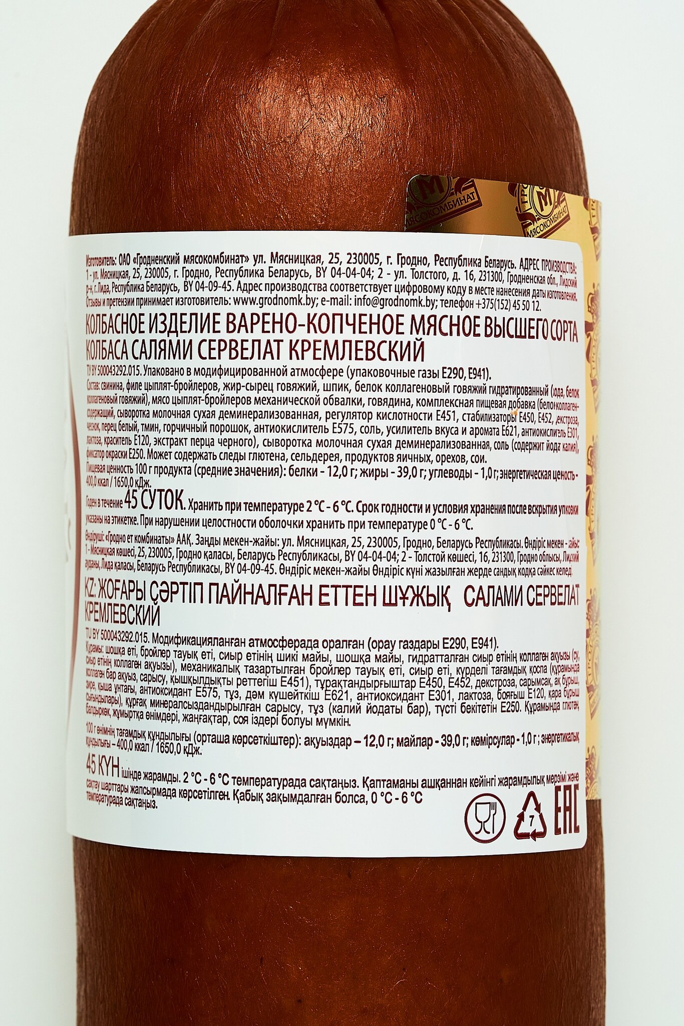 Колбаса салями «Сервелат Кремлевский» — выдержанная варёно-копчёная колбаса с характерным ароматом дыма и плотной текстурой. Состав сбалансирован так, чтобы подчеркнуть вкус говядины и свинины, с лёгкими пряными нотками. Идеальный выбор для элегантной горячей закуски, нарезки на праздничный стол или мясной ассорти.