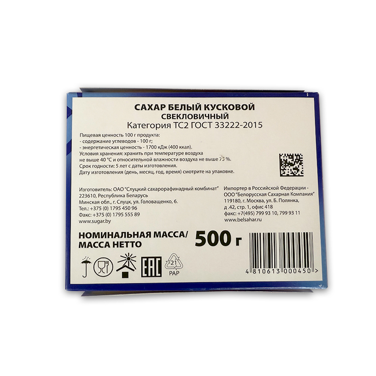 Сахар белый кусковой 500 г под брендом «Слуцкий» — это качественный продукт белорусского производства, изготовленный на Слуцком сахарорафинадном комбинате. Он соответствует ГОСТ 33222-2015, категория ТС2, и представляет собой прессованный сахар в виде кубиков, что обеспечивает удобство при использовании и дозировании.