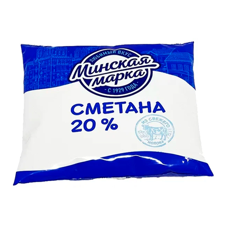 «Минская марка» сметана 20% — это кисломолочный продукт из сливок, сквашенных бактериальной закваской. Обладает классической густой текстурой, сливочным вкусом и умеренно выраженной кислинкой.