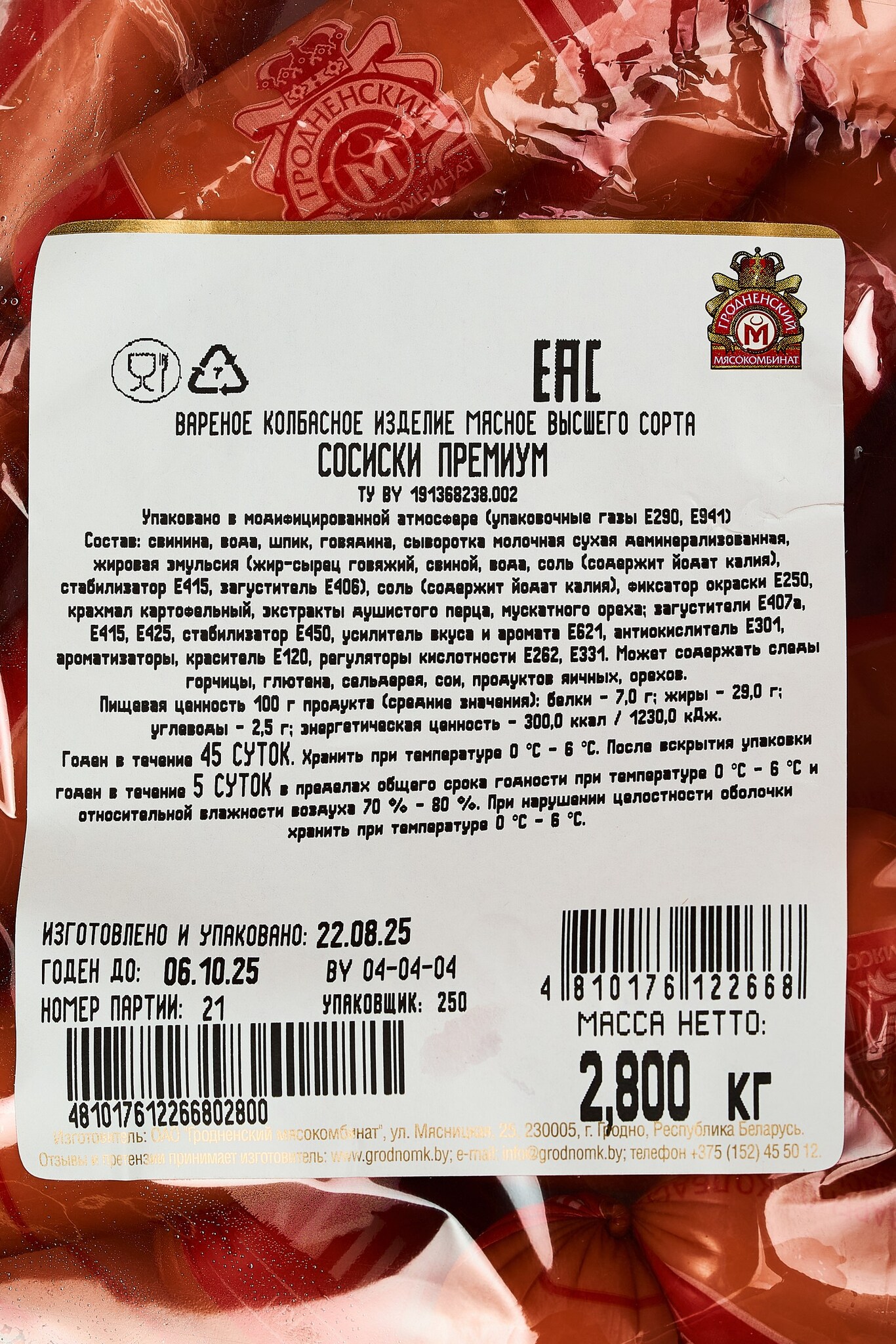 свинина, говядина, шпик, сыворотка молочная сухая деминерализованная, жировая эмульсия (жир-сырец говяжий, свиной, вода, соль), крахмал картофельный, экстракты душистого перца, мускатного ореха, усилитель вкуса и аромата Е621, антиокислитель Е301, ароматизаторы, краситель Е120, регуляторы кислотности Е262, Е331