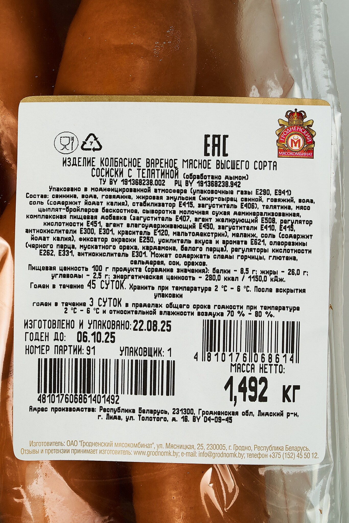 Сосиски «С Телятиной» — варёные изделия высшего сорта с натуральной оболочкой и нежным вкусом телятины. Отлично подходят для завтраков, перекусов и приготовления горячих блюд. Продукт ценится за сочность, мягкую текстуру и сбалансированный вкус, который нравится как детям, так и взрослым.