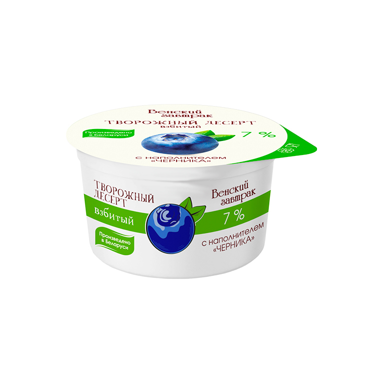 Взбитый творожный десерт «Венский завтрак» с вкусом черники, жирность 7 %. Нежная кремовая текстура и насыщенный ягодный вкус, идеально подходит для завтрака или перекуса.