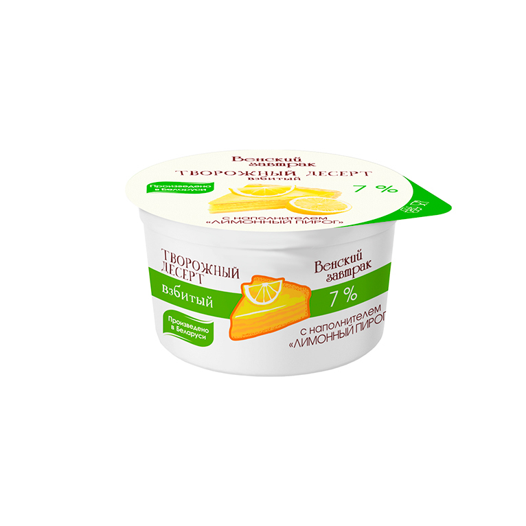 Взбитый творожный десерт «Венский завтрак» с вкусом лимонного пирога, жирность 7 %. Нежная кремовая текстура и освежающий цитрусовый вкус, идеально подходит для завтрака или перекуса.