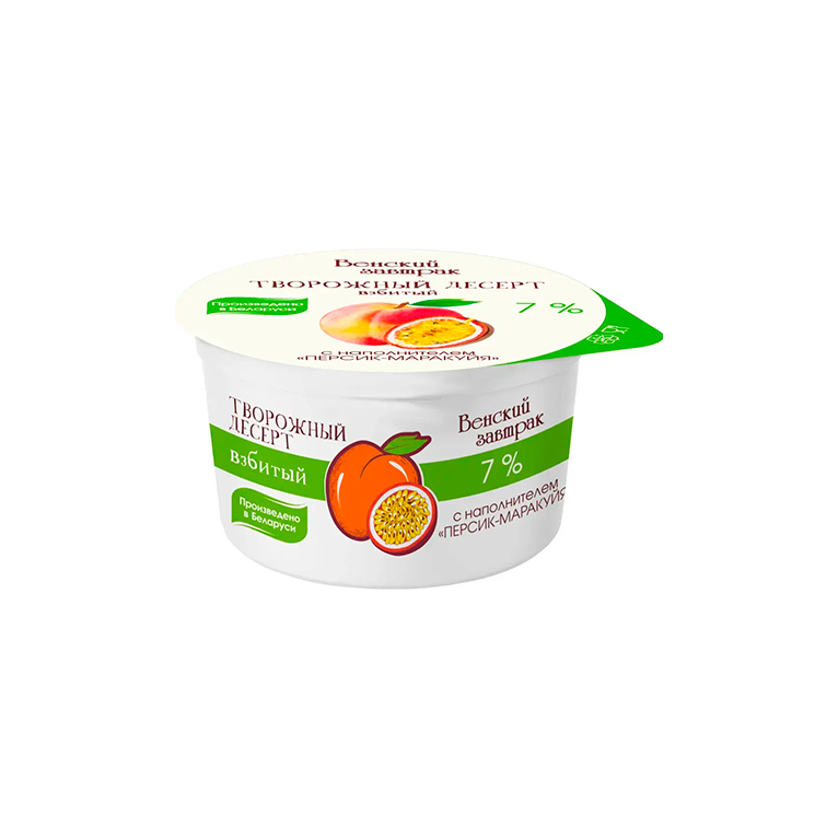 Взбитый творожный десерт «Венский завтрак» с вкусом персика и маракуйи, жирность 7 %. Нежная кремовая текстура и яркий фруктовый вкус, идеально подходит для завтрака или перекуса.