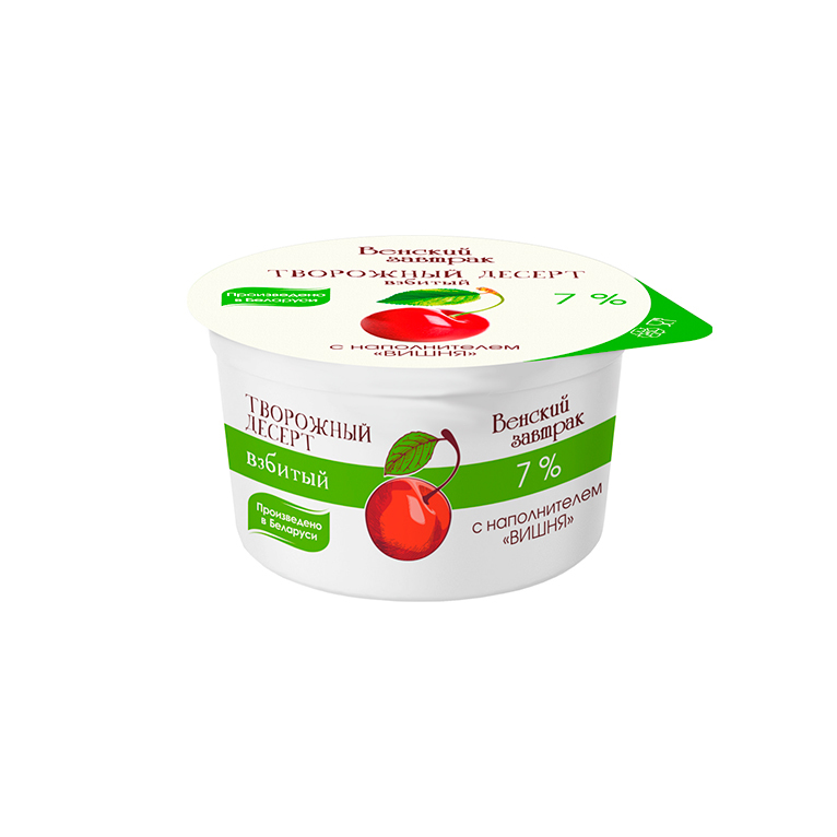 Взбитый творожный десерт «Венский завтрак» с вкусом вишни, жирность 7 %. Нежная кремовая текстура и яркий фруктовый вкус, идеально подходит для завтрака или перекуса.